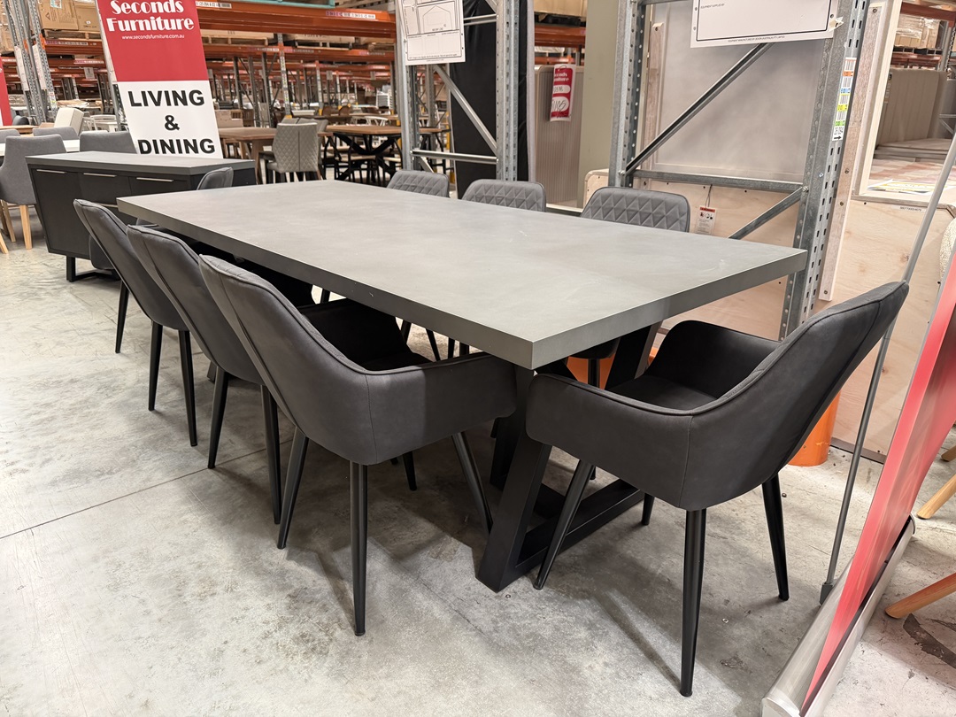 A bold dining set featuring a sturdy concrete-look tabletop in dark grey, paired with eight matching fabric dining chairs. Ideal for large dining spaces seeking a modern industrial touch.