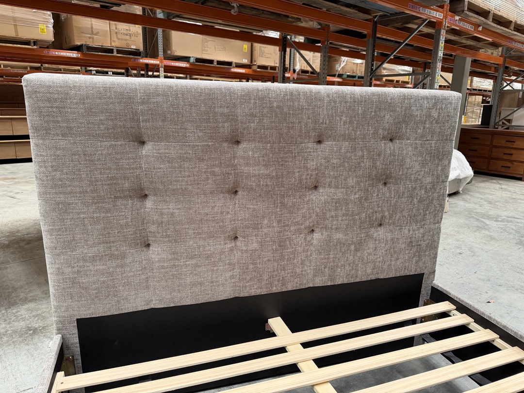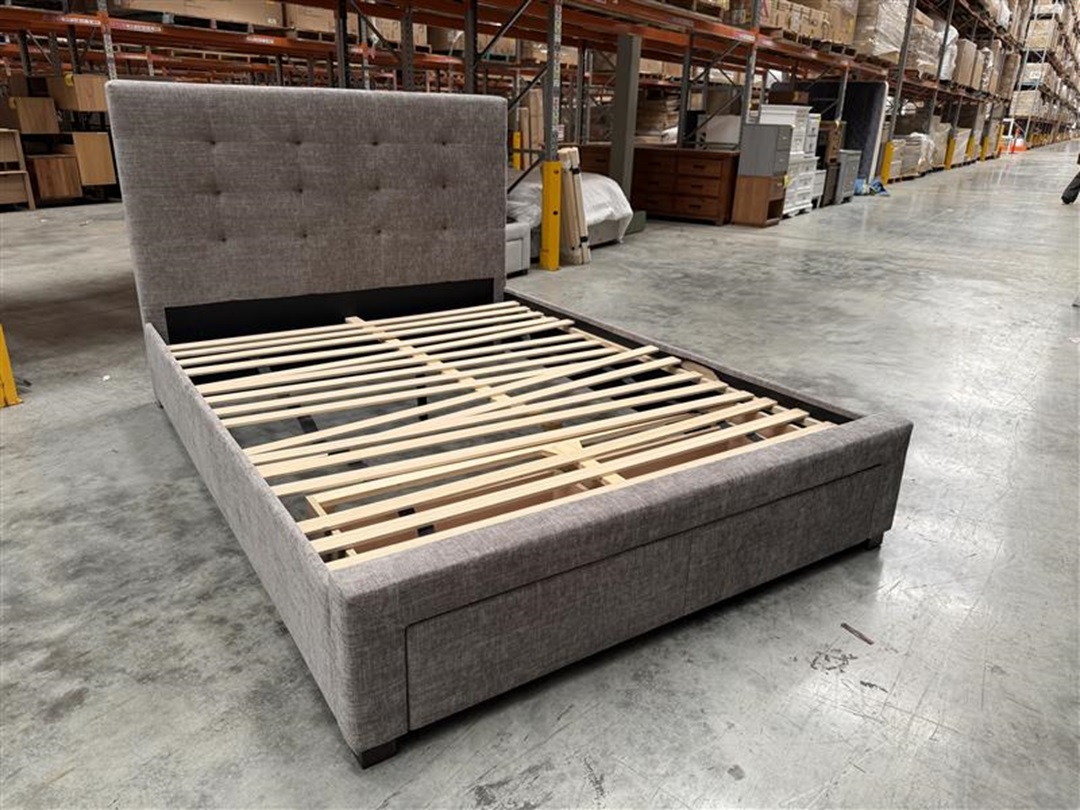 A functional and stylish queen bed featuring dark grey fabric upholstery and two built-in storage drawers. Perfect for maximizing space while maintaining a sleek modern design.