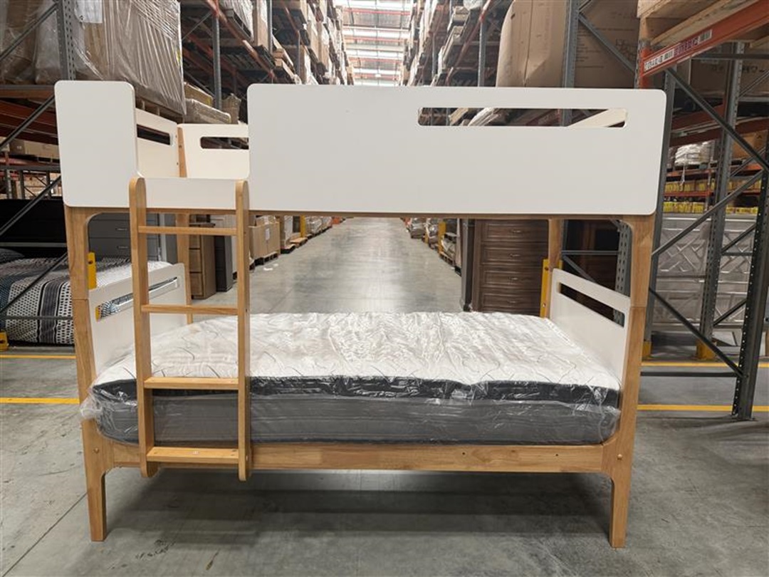Practical and space-saving, this bunk bed features a sturdy white metal frame with a single top bunk and a double-size lower bunk—perfect for kids’ rooms, guest rooms, or shared spaces.