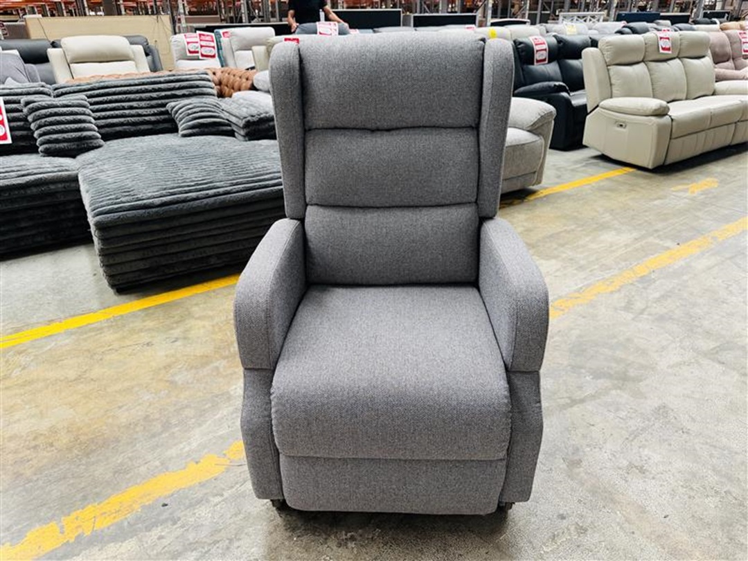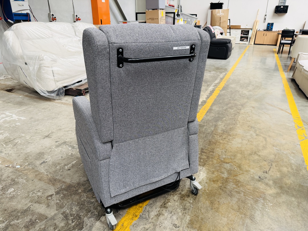 A functional and stylish lift chair in dark grey fabric, featuring dual motor adjustment and wheels for easy movement and flexibility.