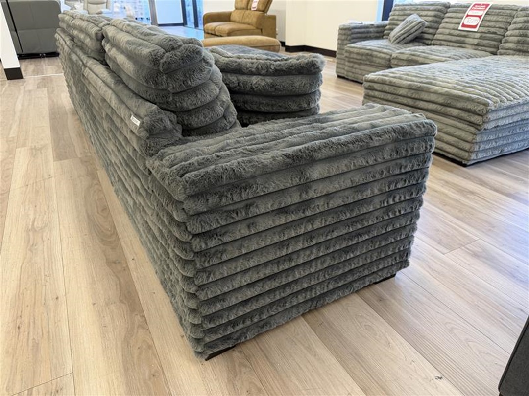 A spacious chaise lounge upholstered in durable dark grey fabric. Its generous seating and modern shape make it ideal for relaxing in living rooms or entertainment areas.