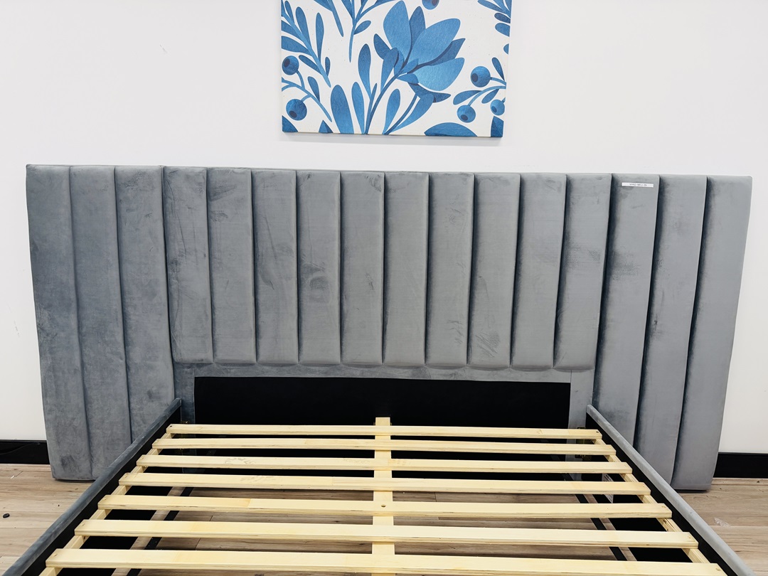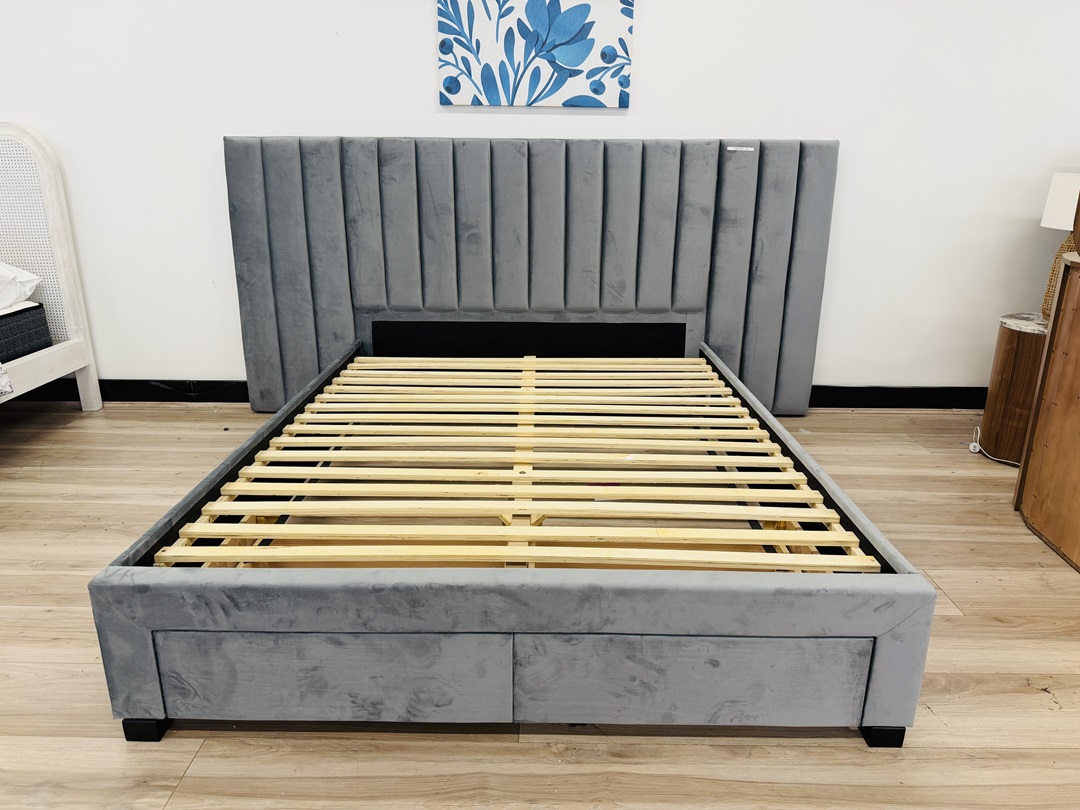 Modern and functional, this queen bed is upholstered in dark grey fabric and features two built-in storage drawers. The extended headboard adds a luxurious statement while providing extra comfort and practicality.