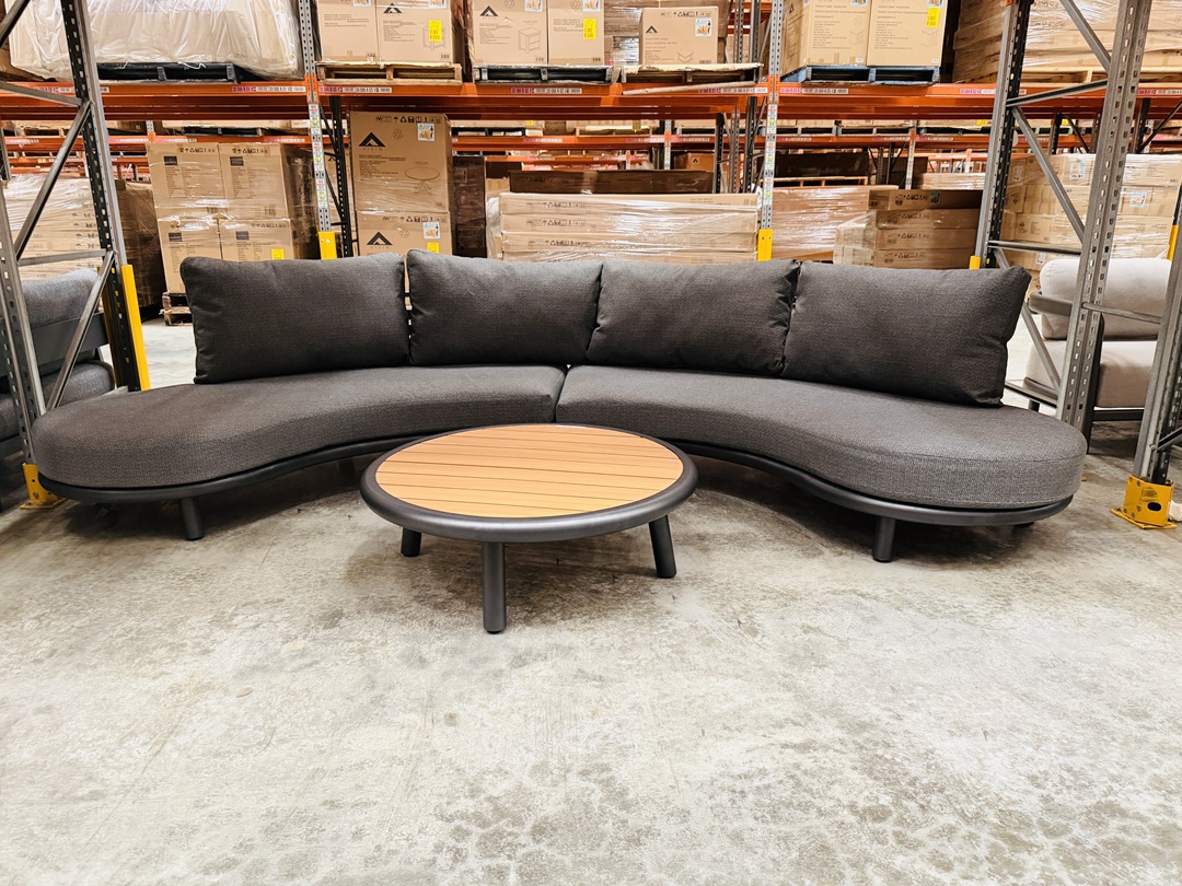 The Dark Grey Outdoor Sofa with Round Coffee Table pairs relaxed sofa seating with a matching round coffee table, offering a practical and stylish setup for outdoor lounging.
