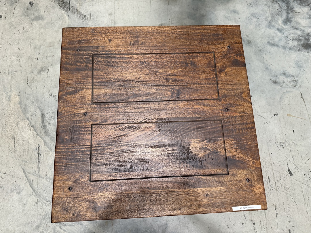 This compact square side table is made from dark honey timber, showcasing the natural wood grain. Ideal for placing beside sofas or beds, adding warmth and rustic charm to any space.