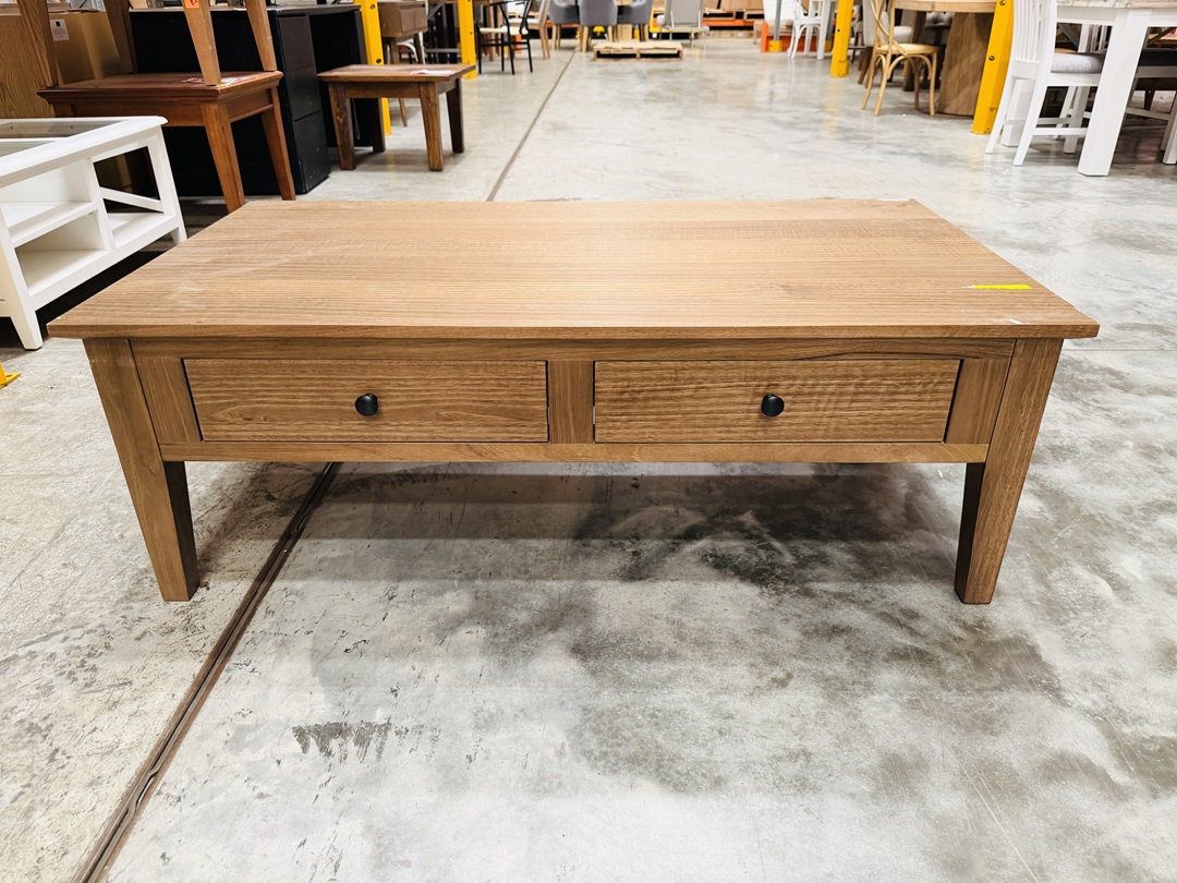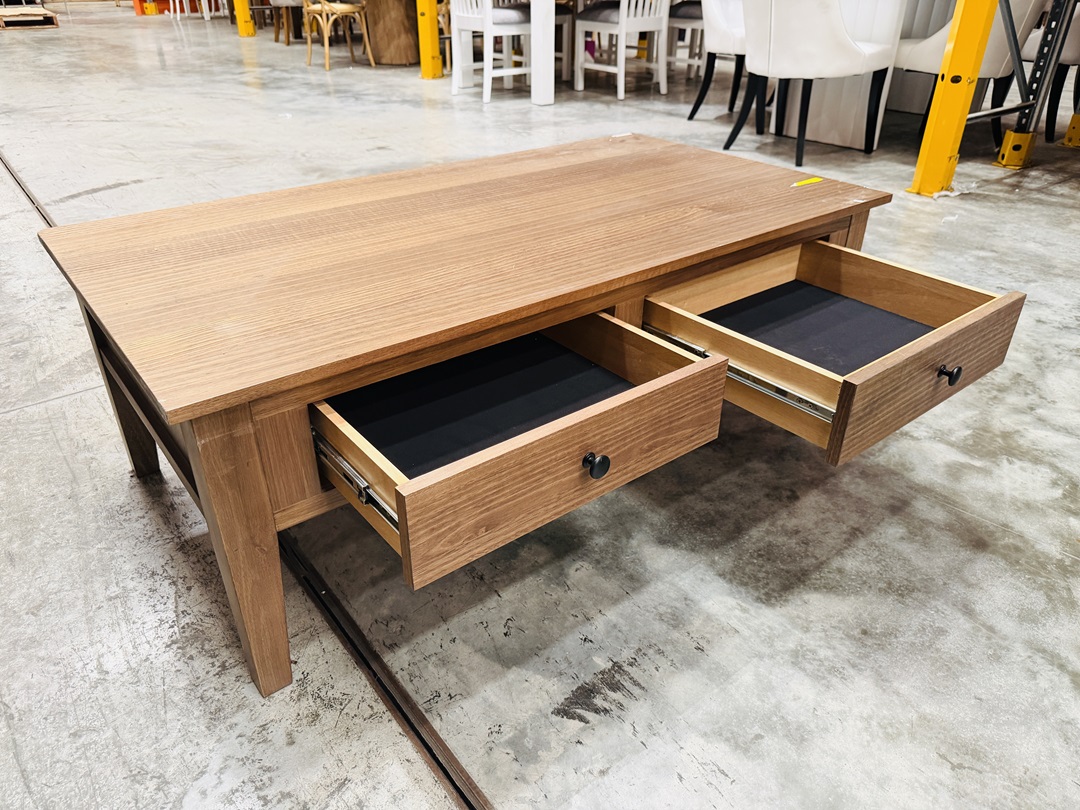 A solid coffee table finished in rich dark oak timber. With two practical drawers for hidden storage and a spacious top surface, it’s both a stylish and functional centerpiece for your living room.