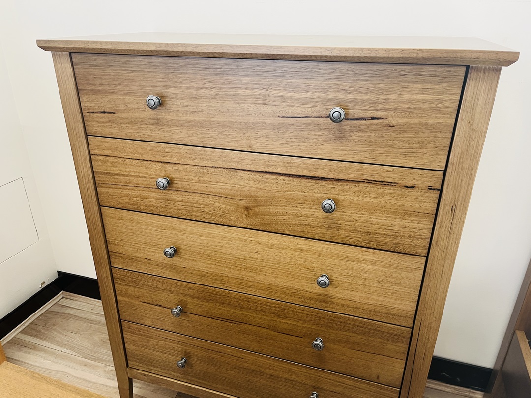 A stylish and practical dresser made from rich chocolate-colored timber, featuring six spacious drawers for ample storage in your bedroom.