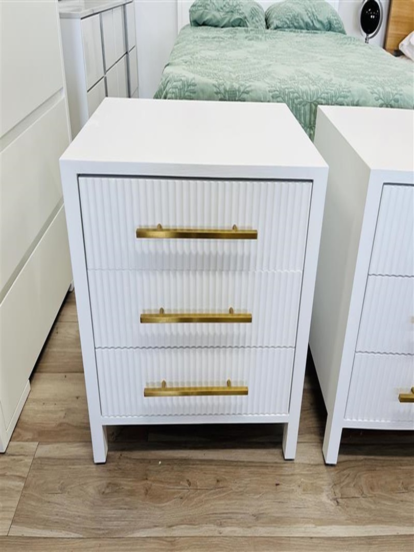 A charming whitewash timber bedroom suite, featuring a queen bed, two bedside tables, and a tallboy. Ideal for coastal, rustic, or farmhouse-inspired interiors.