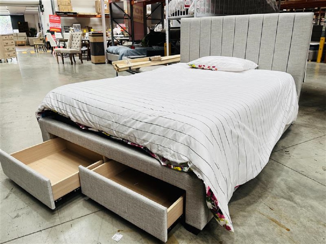 This queen-sized bed in frost grey fabric features built-in storage for a clutter-free bedroom. Its sleek, minimal design blends perfectly with contemporary interiors while maximizing space.
