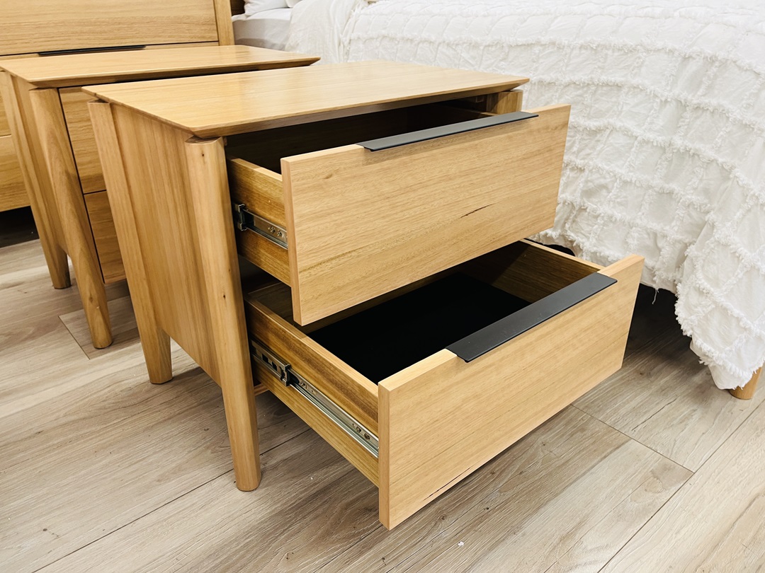 A bold and modern suite, this 4-piece set includes a queen bed frame, two matching bedsides, and a coordinating dresser. The sleek black timber brings contemporary sophistication and pairs well with light linens and metallic accents.