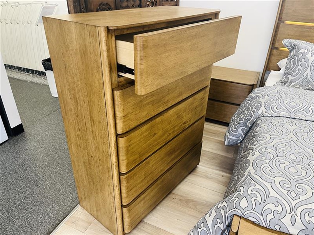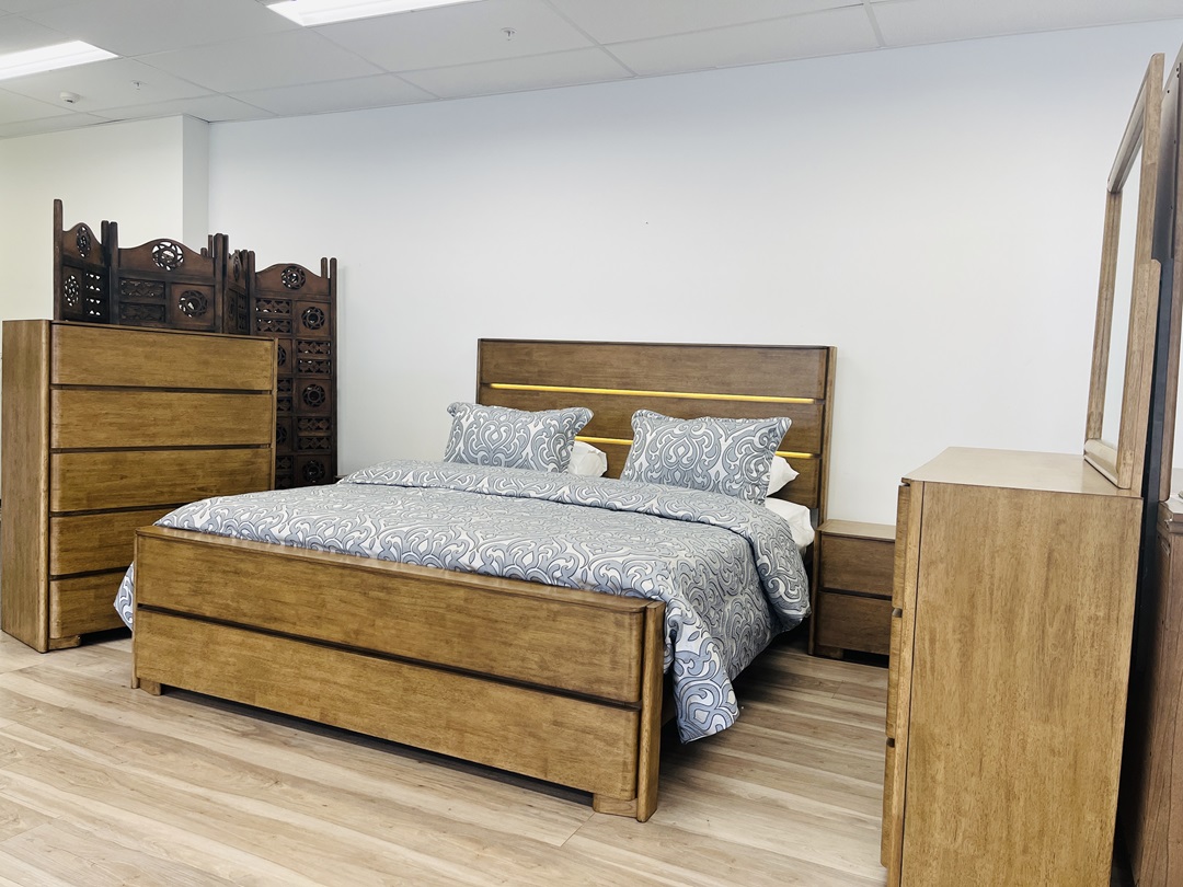 Crafted from premium golden oak timber, this elegant 5-piece suite includes a king bed with integrated LED lights, matching bedsides, tallboy, and dresser. The natural oak finish adds warmth and sophistication to any bedroom