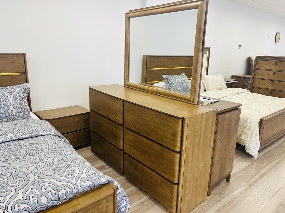 Crafted from premium golden oak timber, this elegant 5-piece suite includes a king bed with integrated LED lights, matching bedsides, tallboy, and dresser. The natural oak finish adds warmth and sophistication to any bedroom.