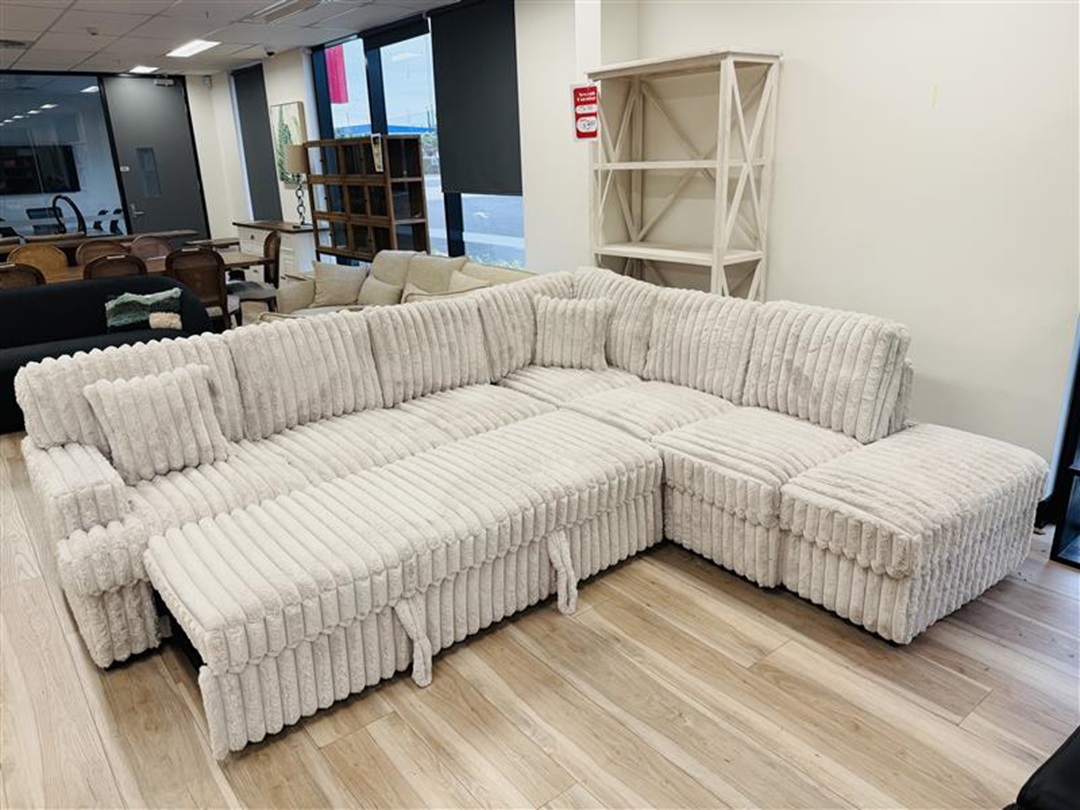 Designed for both comfort and functionality, this ivory fabric corner sofa easily converts into a pull-out sofabed for guests. It also includes built-in storage, making it a smart space-saving solution for modern living areas.