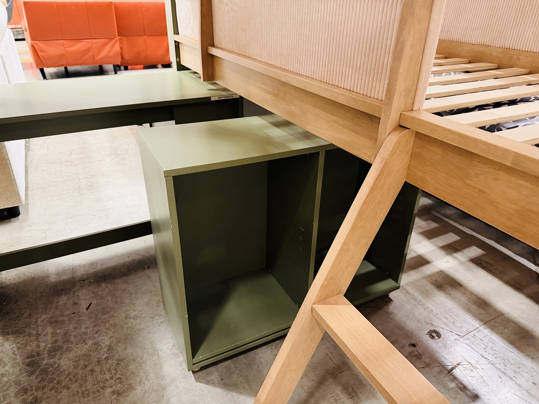 The Green & Natural 4pc Loft Kids Bed with Pullout Desk & Storage is a smart space-saving solution featuring a raised bed, integrated pullout study desk, and built-in storage, finished in playful green and natural tones.