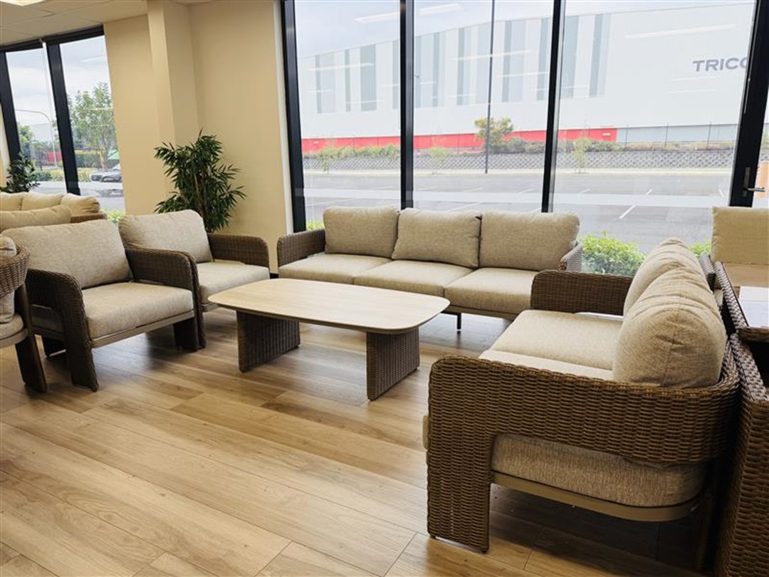 A contemporary outdoor lounge solution with natural textures and a neutral sand tone, perfect for relaxed entertaining.