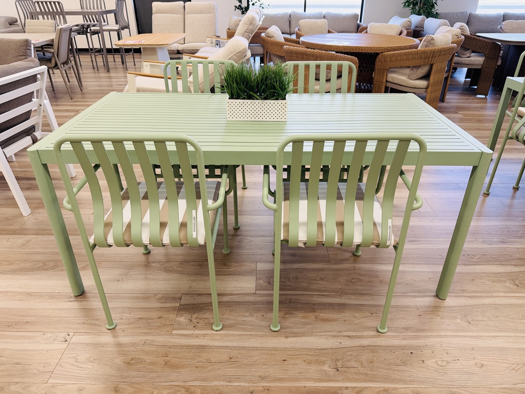 The Green Outdoor 5pc Dining Set with Striped Cushions adds a pop of colour to your outdoor area, pairing supportive seating with soft striped cushions for a relaxed and cheerful dining experience.