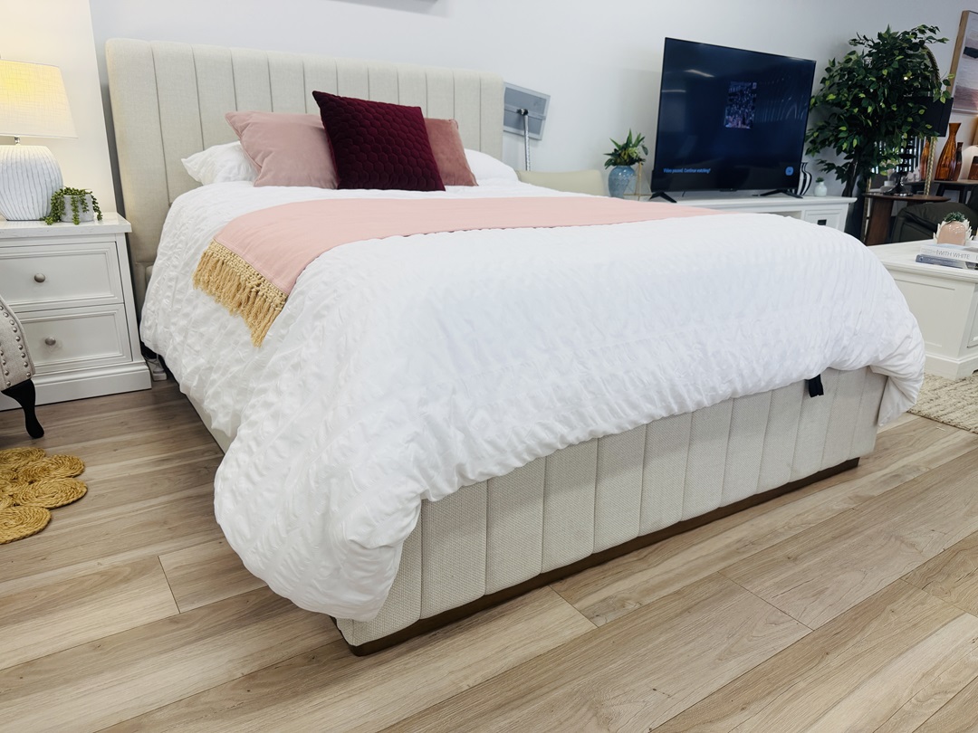 A stylish queen bed upholstered in soft oatmeal fabric, paired with a comfortable mattress for complete support. The gaslift mechanism provides easy-access under-bed storage without compromising on comfort or style.