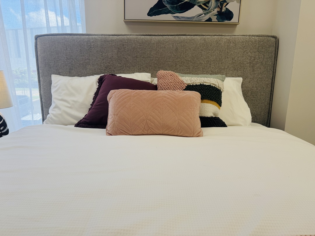 A modern queen bed upholstered in soft grey fabric, offering both comfort and contemporary style. Its clean design makes it a versatile centerpiece for a wide range of bedroom interiors.
