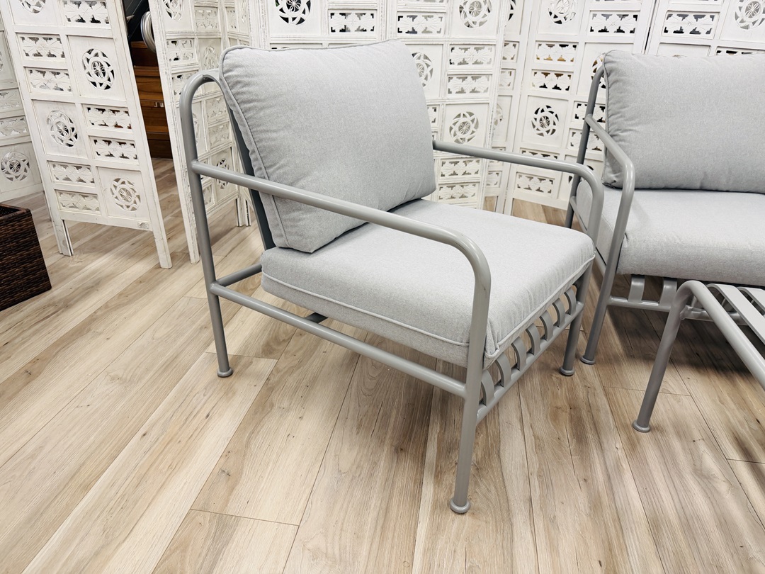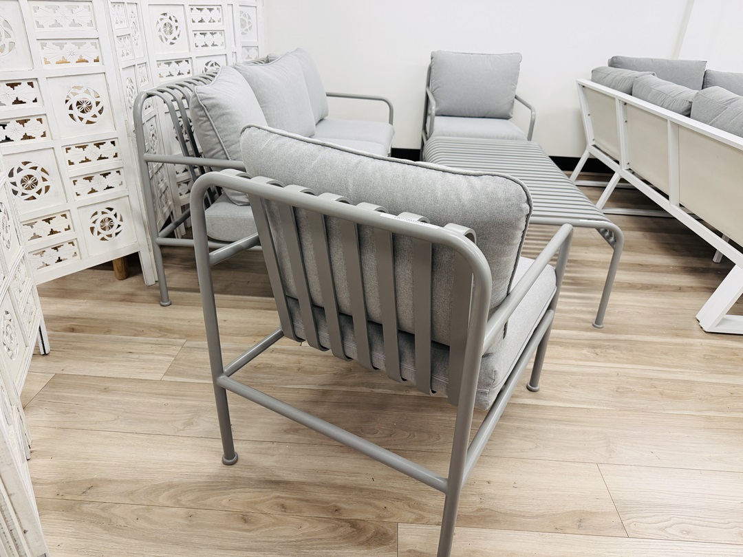 Built with a strong grey metal frame, this four-piece outdoor sofa set offers reliable durability and contemporary styling. With comfortable seating and clean lines, it is ideal for creating a relaxed and inviting outdoor lounge area.