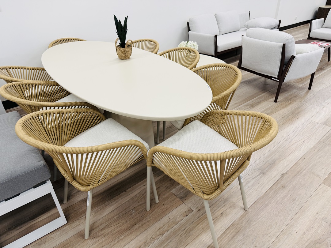 The Outdoor Alu & Wicker 7pc Round Dining Setting blends aluminium strength with woven wicker detailing for a stylish yet durable outdoor dining solution. The round table design encourages easy conversation and social dining