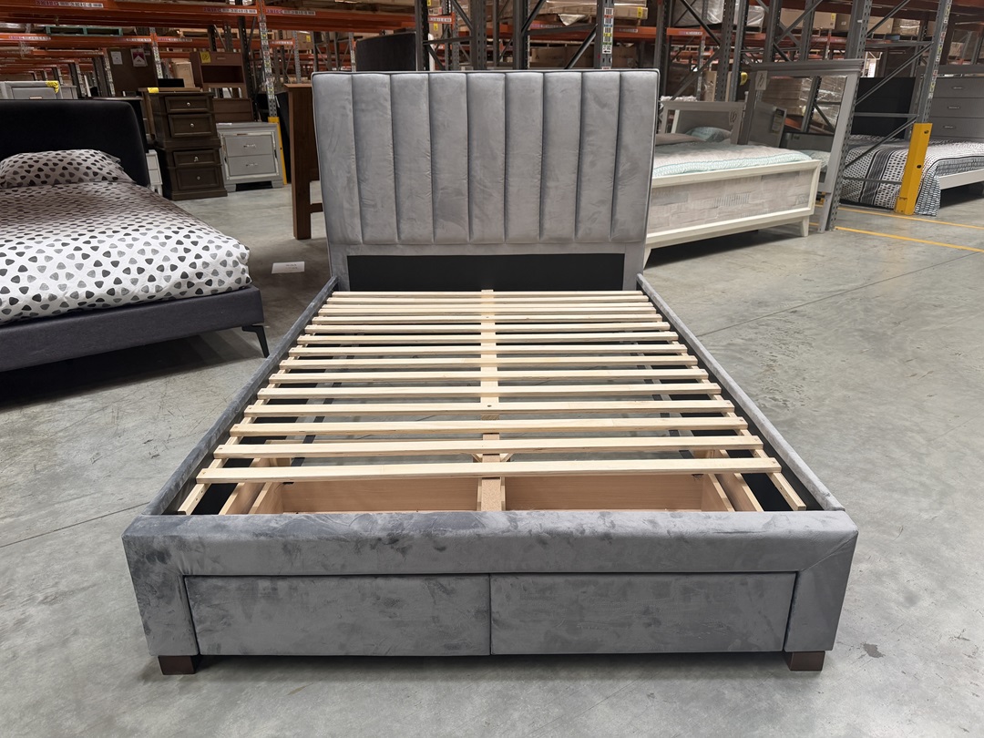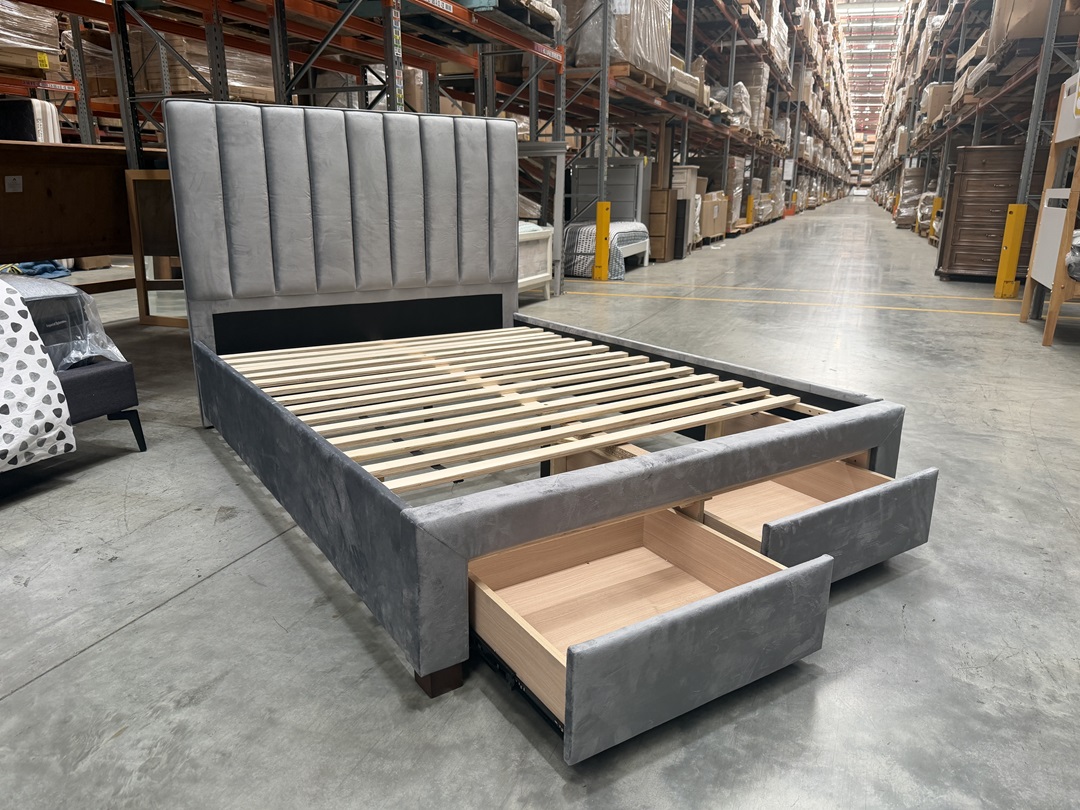 A luxurious double bed upholstered in plush grey velvet. Features two integrated storage drawers for added convenience, blending elegance with practical bedroom storage.