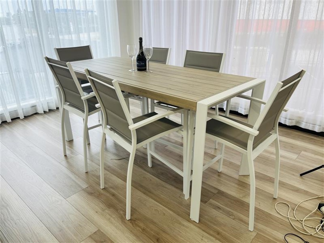 Sleek and modern, this set includes a large rectangular table and six chairs, made from sturdy aluminum for a stylish, low-maintenance outdoor dining experience.
