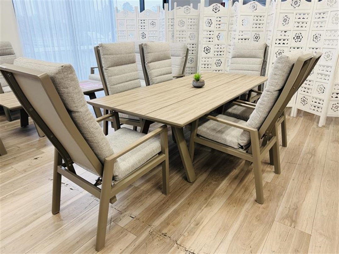 The Outdoor Alu & Wicker 7pc Round Dining Setting blends aluminium strength with woven wicker detailing for a stylish yet durable outdoor dining solution. The round table design encourages easy conversation and social dining