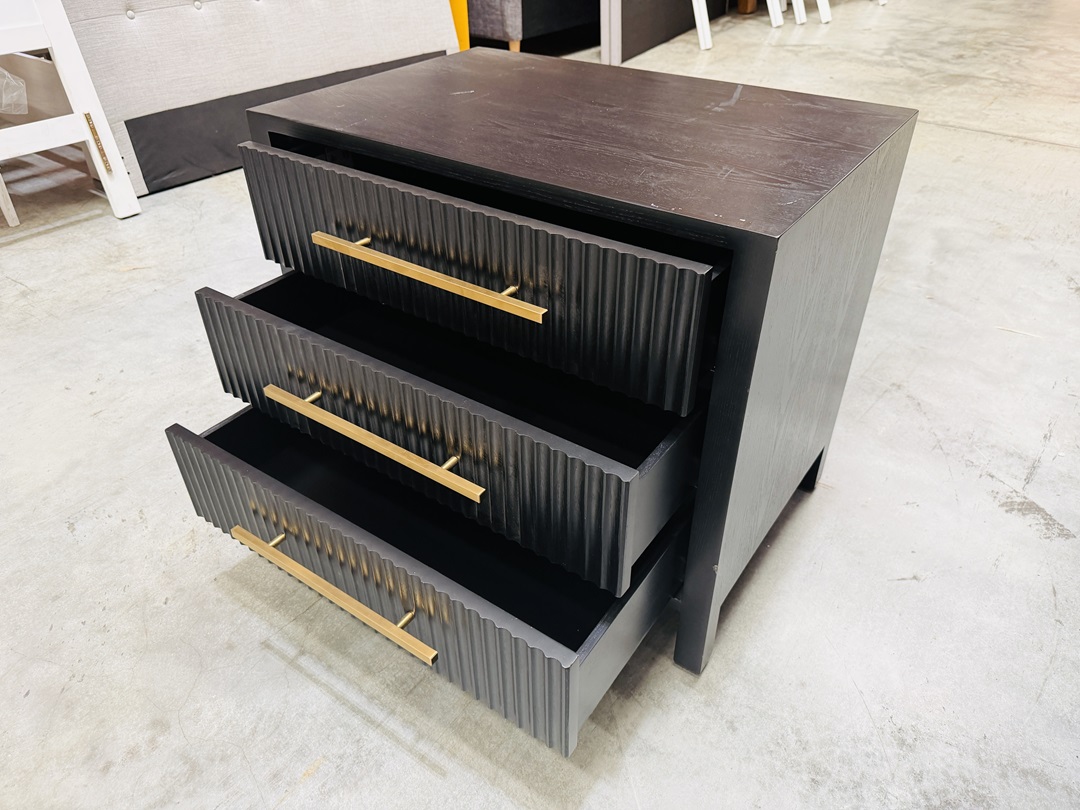 A stylish and spacious bedside table finished in sleek black with elegant gold handles. Featuring three generous drawers, it offers practical storage while adding a touch of modern luxury to your bedroom.
