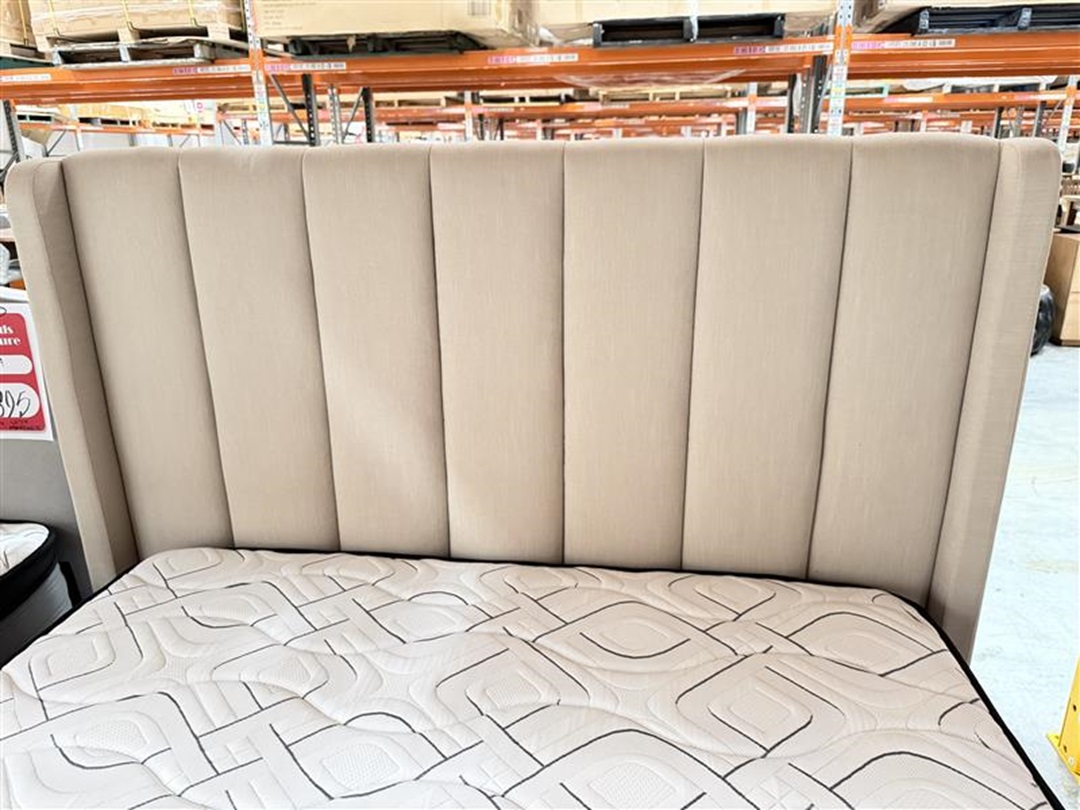 Elegant and practical, this queen bed is upholstered in soft light beige fabric with two under-bed drawers for convenient storage. Its neutral tone complements any bedroom décor. Built for comfort and functionality.