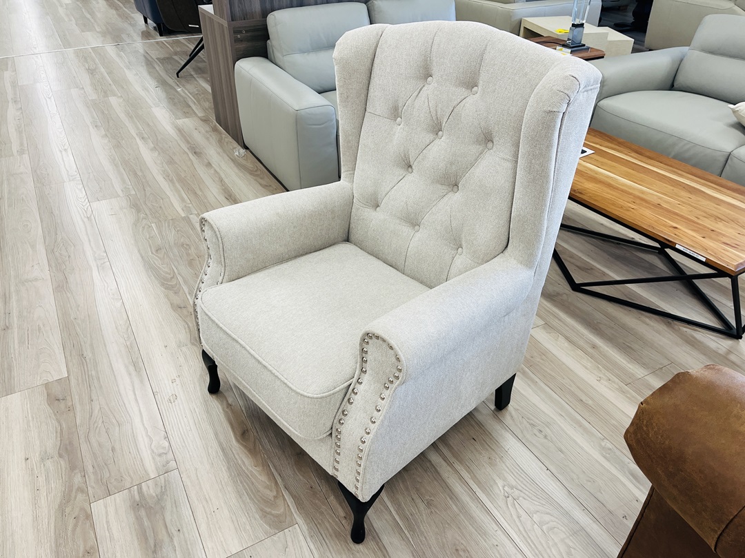 A classic wingback chair in light beige fabric, enhanced with decorative stud detailing. Offers a perfect blend of comfort and traditional charm. Ideal for accent seating in living rooms or bedrooms.