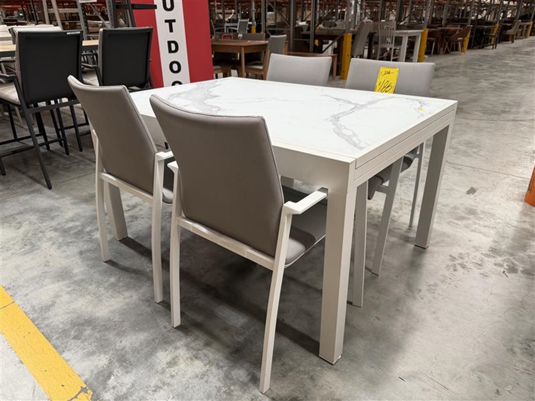 A chic and elegant outdoor dining chair featuring a stylish combination of white and champagne colors, designed to provide comfort and sophistication for your outdoor dining area.