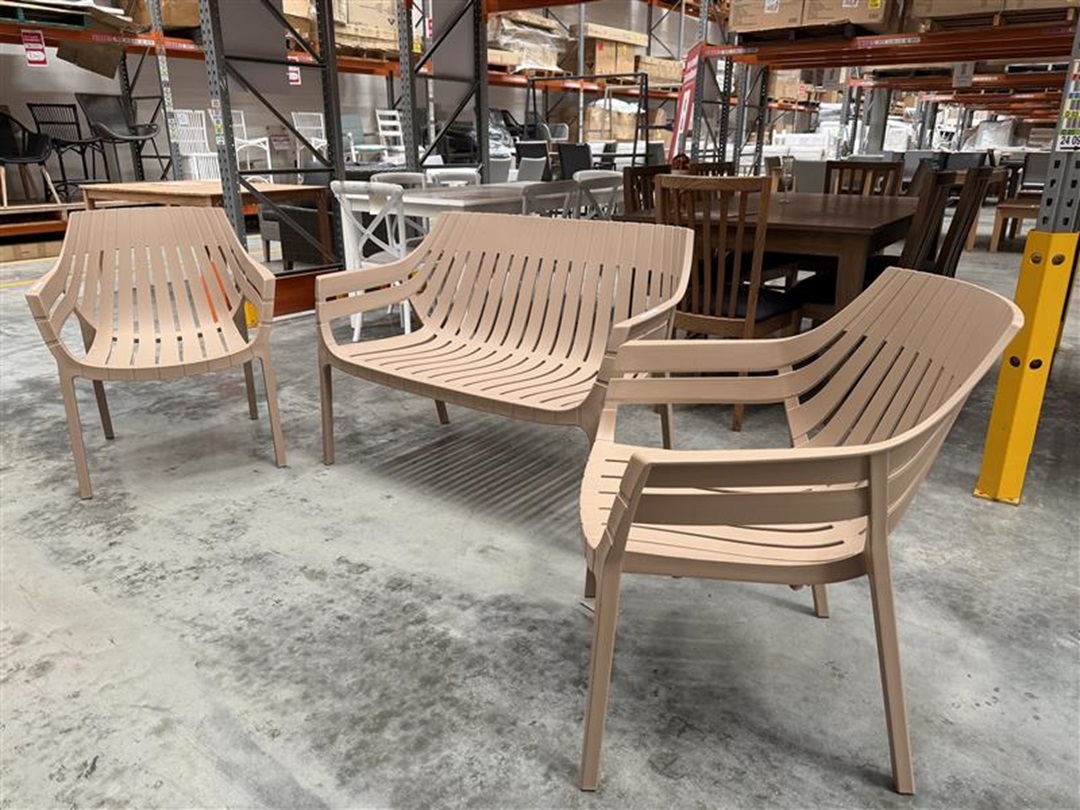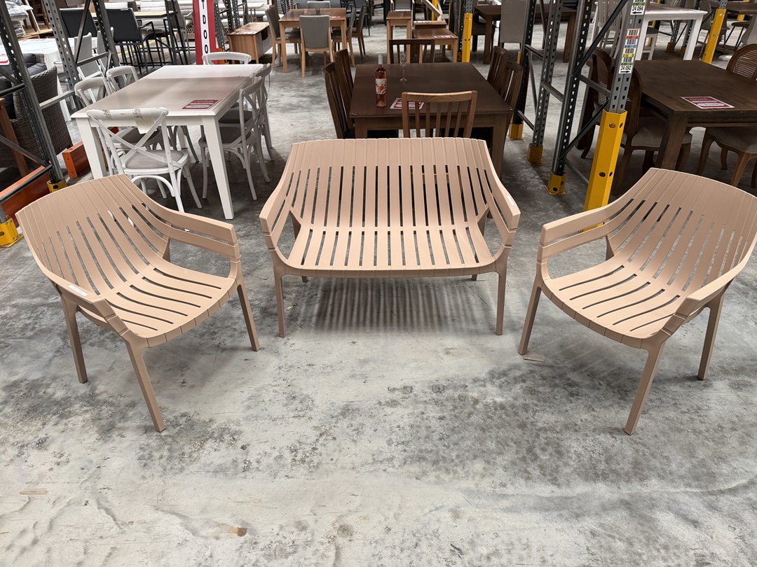 A simple and stylish 3-piece outdoor setting in light brown tones. Includes two comfortable outdoor chairs and a matching table, perfect for balconies, patios, or small outdoor spaces.