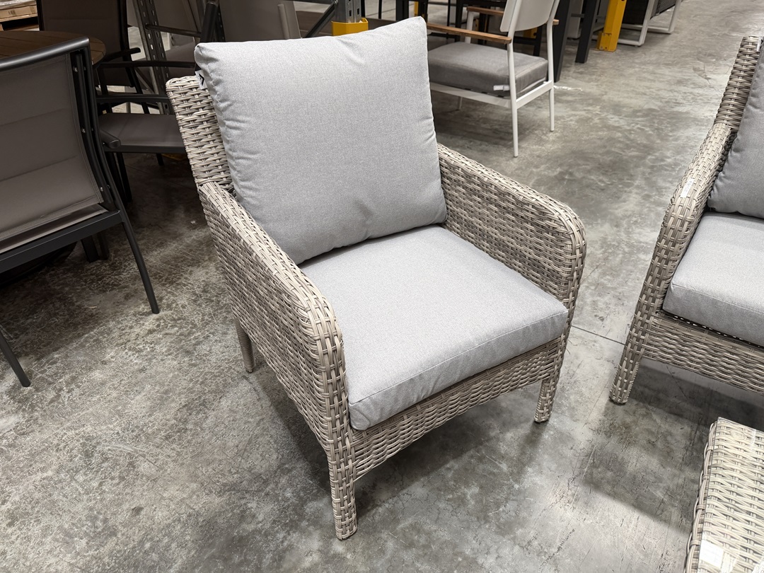 A modern corner dining set in taupe, offering a space-efficient solution for outdoor dining. Includes corner seating, a table, and additional chairs.