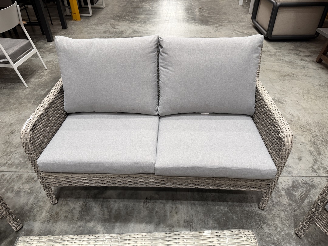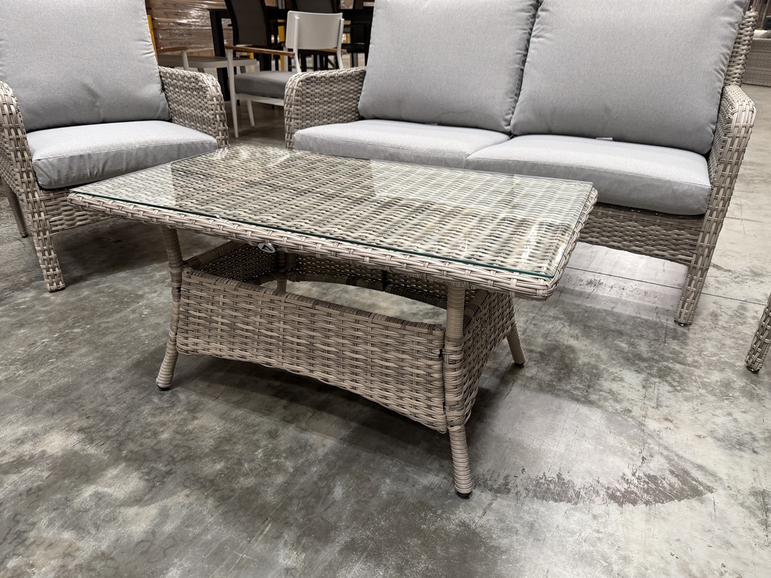 A stylish 4-piece outdoor set crafted with weather-resistant light grey wicker. Includes a sofa, two chairs, and a matching table—perfect for patios or garden seating.