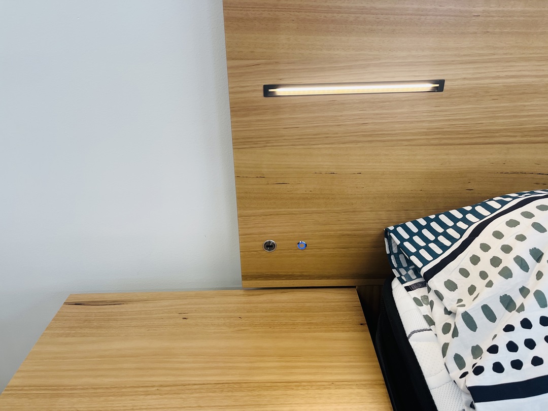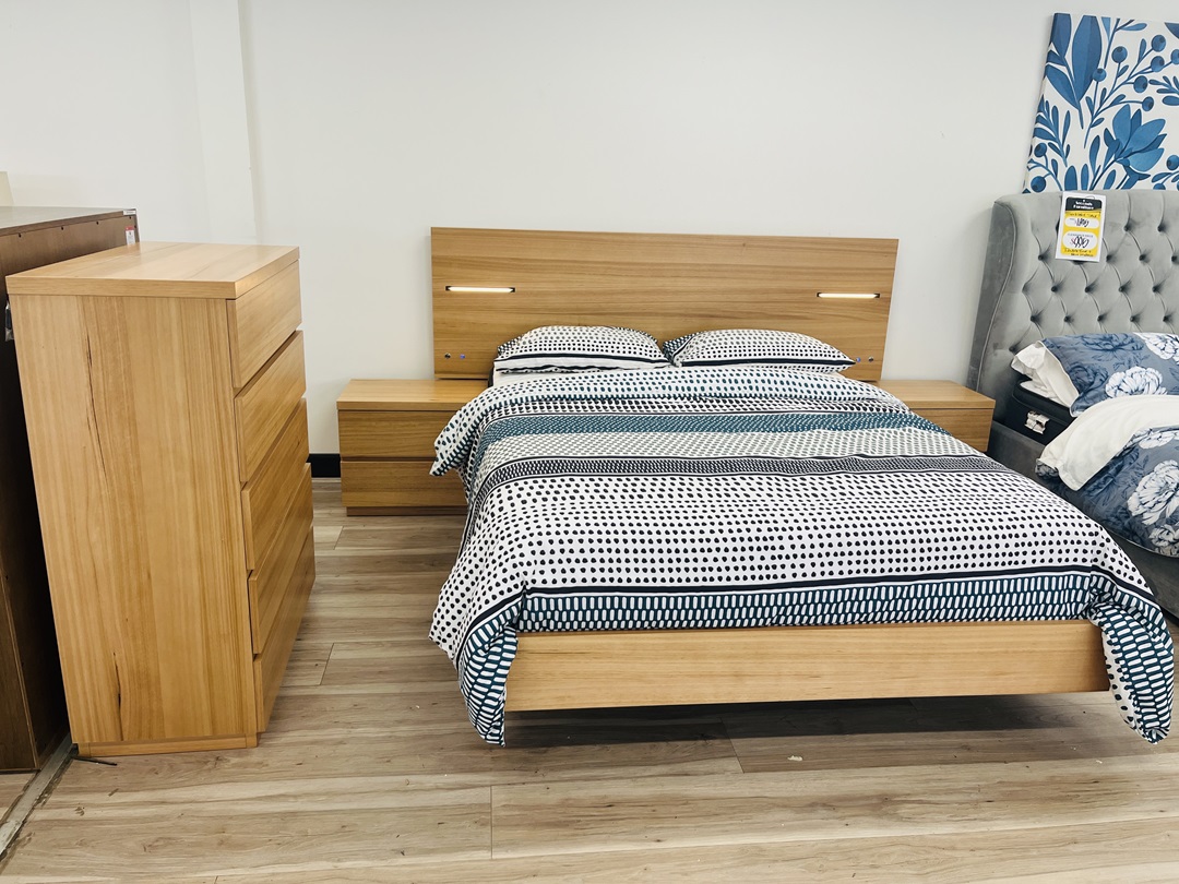 Crafted from light honey timber, this queen suite brings a soft, inviting tone to any space. The built-in lights and USB ports add a touch of modern functionality. Designed to combine natural charm with everyday comfort.