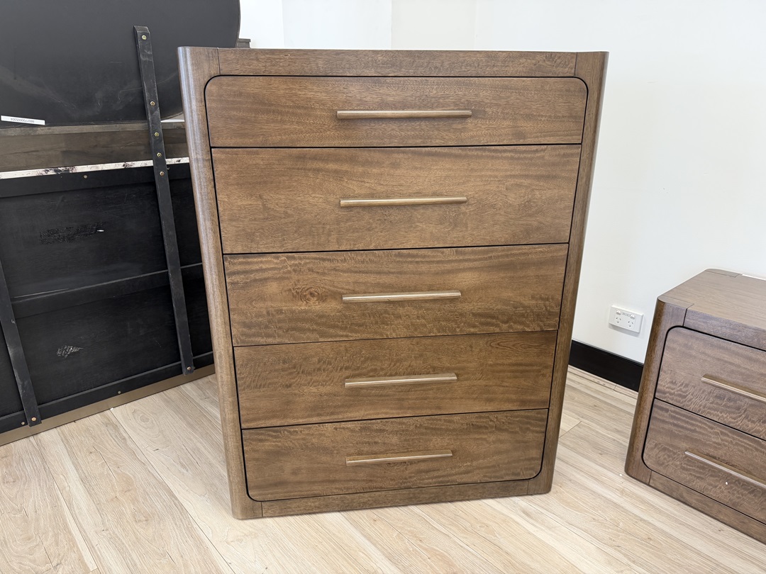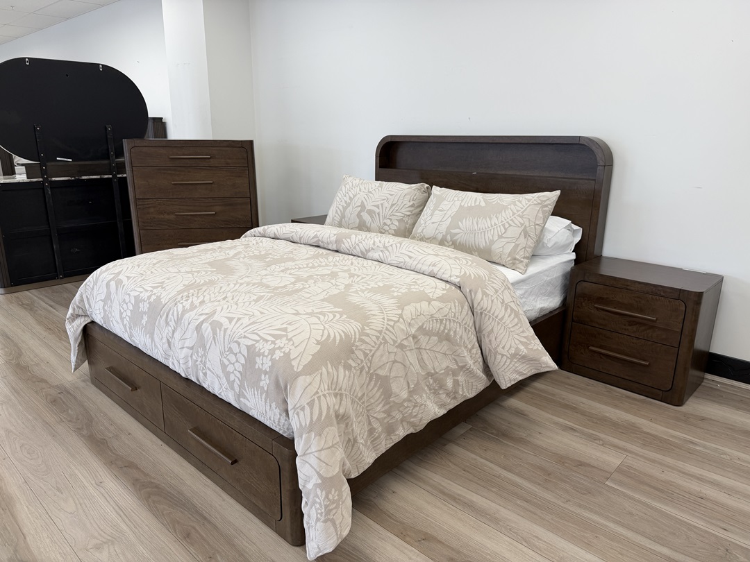 A rich mocca acacia timber suite with a queen storage bed and tallboy, offering warm natural tones and generous built-in storage for a complete bedroom look.