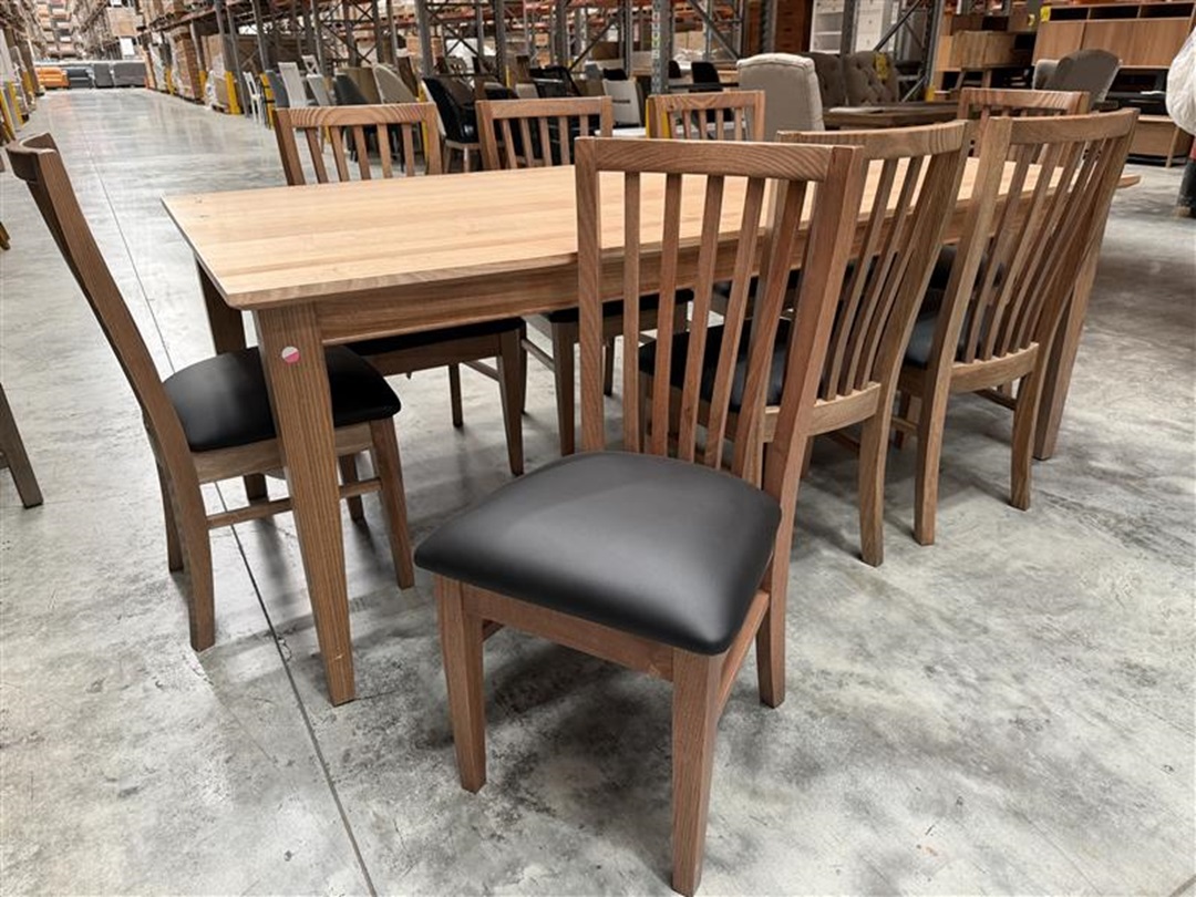 A spacious natural timber dining table paired with eight matching slatback chairs that creates a warm, inviting space for family meals, gatherings, and entertaining guests.