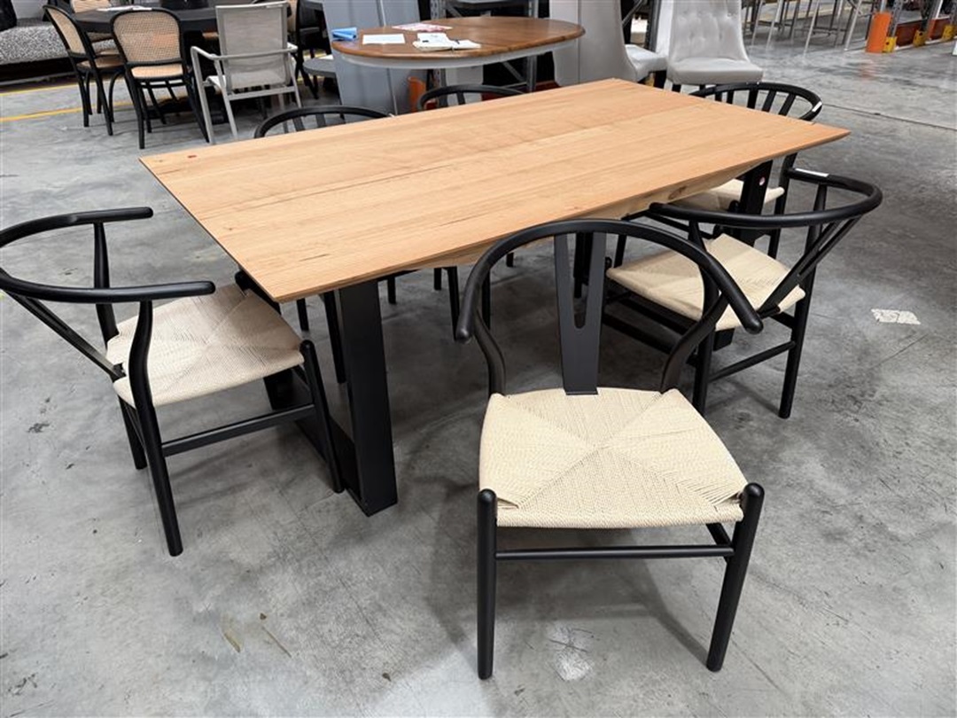 A timeless dining setting featuring a natural timber tabletop paired with six classic wishbone chairs. Blending natural textures with modern design, this set offers comfort, durability, and effortless style for everyday dining.