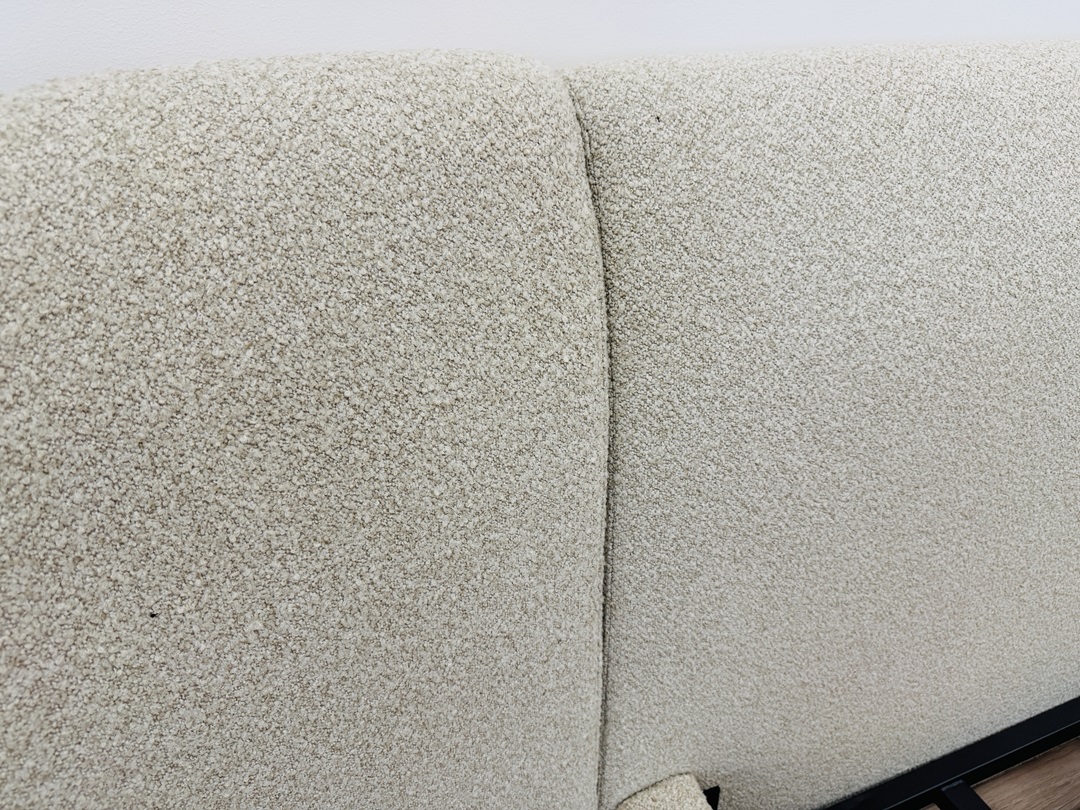 This contemporary queen bed features soft oatmeal fabric upholstery and a beautifully extended headboard that creates a luxurious statement. Perfect for adding comfort and sophistication to any modern bedroom.
