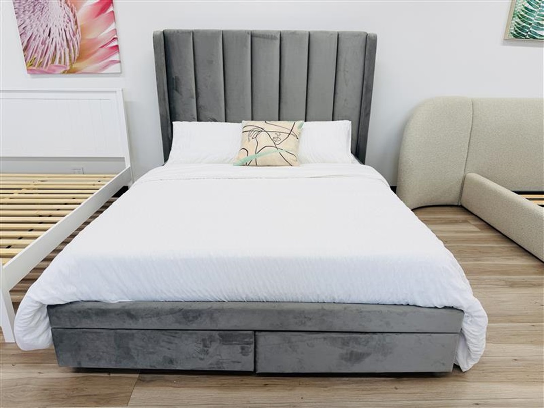 A modern queen bed upholstered in soft light grey fabric, featuring a padded headboard for comfort and style. Its neutral color and sleek design make it a versatile choice for contemporary bedrooms.