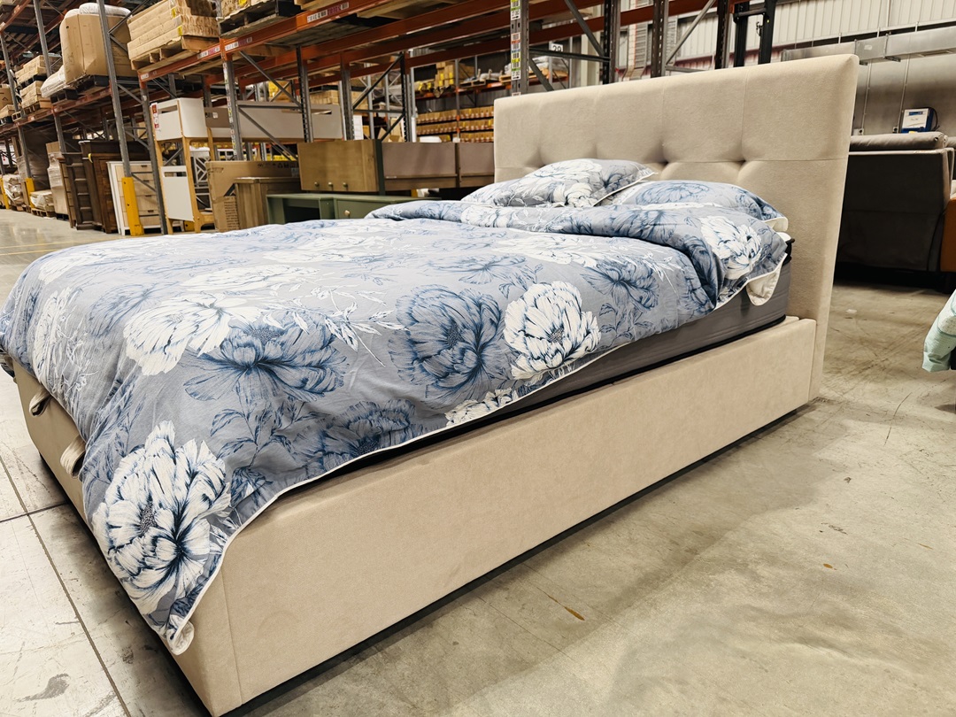 A stylish queen bed upholstered in soft oatmeal fabric, paired with a comfortable mattress for complete support. The gaslift mechanism provides easy-access under-bed storage without compromising on comfort or style.