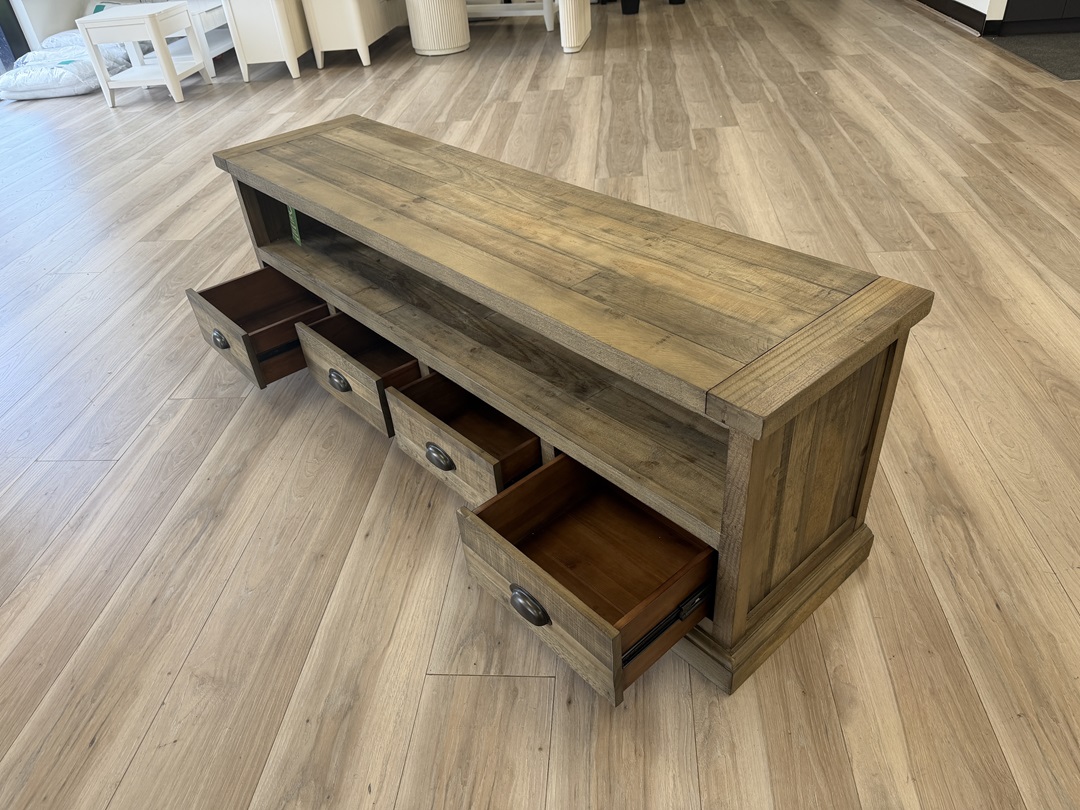 A long 180 cm pine TV unit that includes four useful drawers for storage and an open shelf for consoles or accessories. Ideal for large TVs and organized entertainment setups.