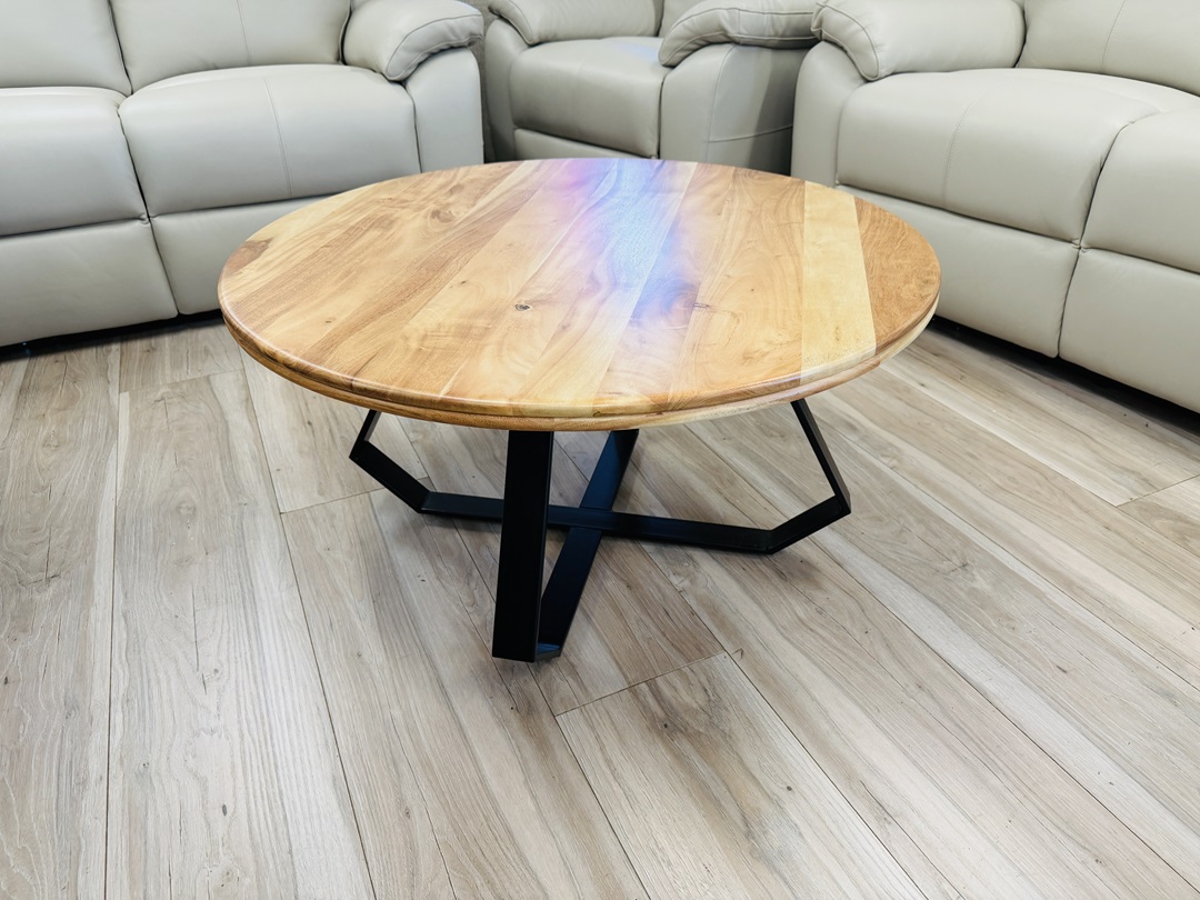 This coffee table combines a warm round timber top with sleek metal legs for a modern industrial feel. Its sturdy construction and compact shape make it ideal for everyday use while enhancing contemporary living spaces.