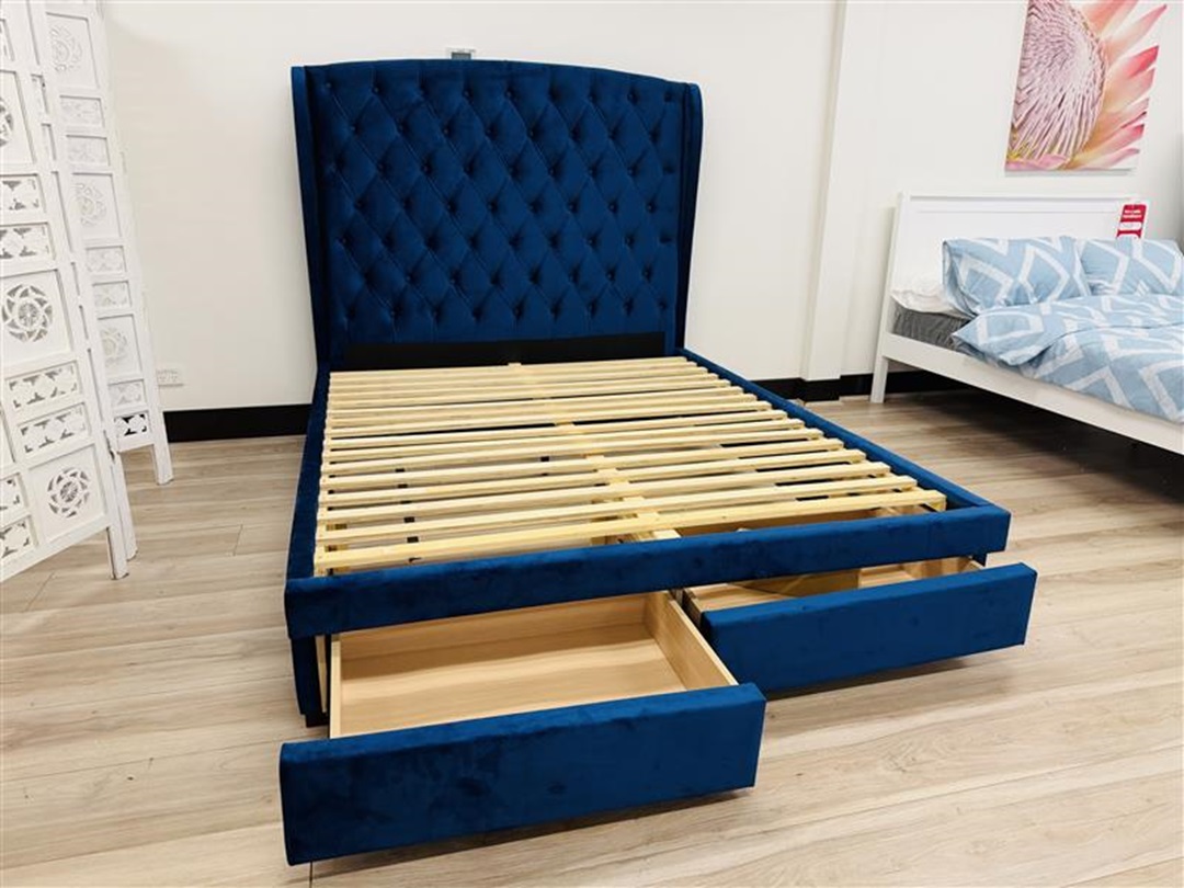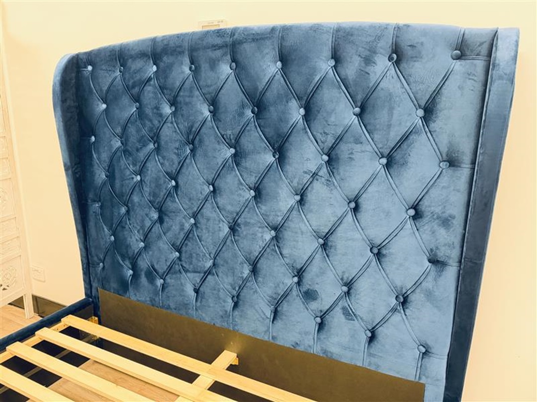 Make a bold statement with this royal blue fabric queen bed, featuring soft upholstered detailing and a modern design. Combining comfort and style, it adds a luxurious touch to any bedroom décor.