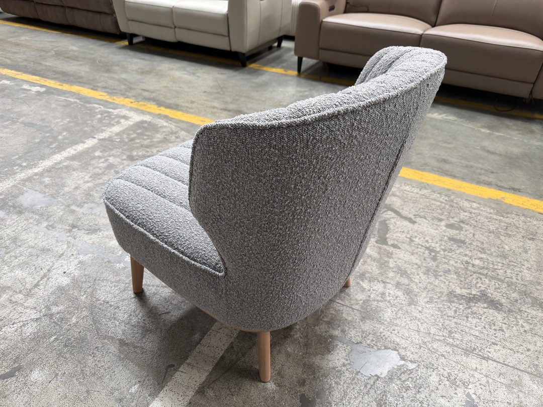 A chic accent chair in silver boucle fabric. Stylish and comfortable, ideal as a statement piece for living rooms, bedrooms, or reading spaces.