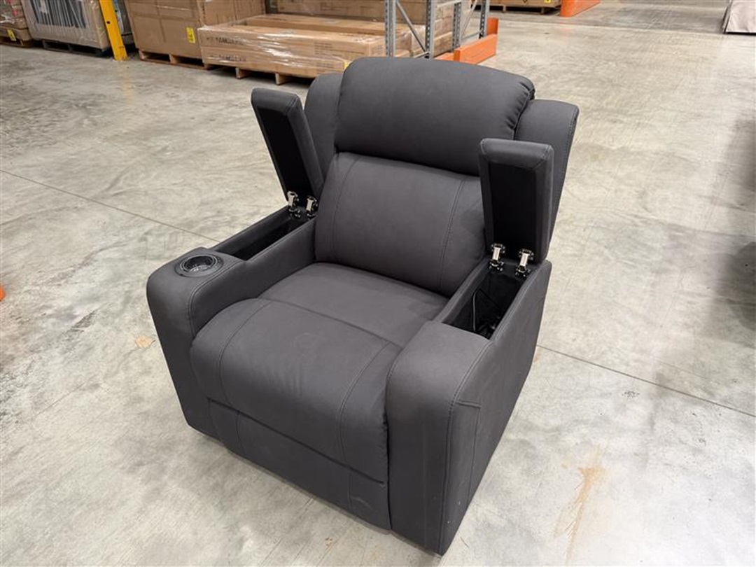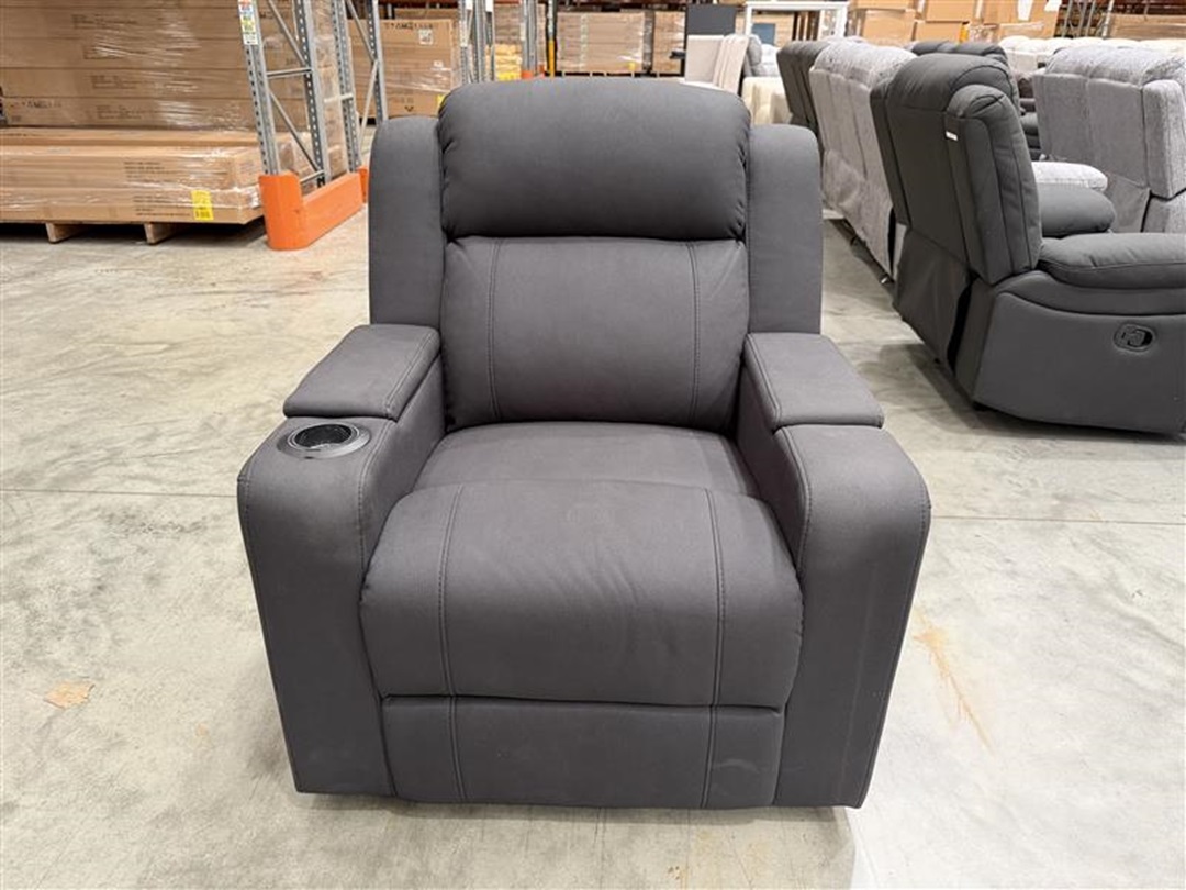 Experience next-level comfort with this slate fabric recliner featuring dual-motor electric adjustment. Includes built-in cupholders, ambient lighting, USB charging port, and hidden storage—ideal for ultimate relaxation and convenience.