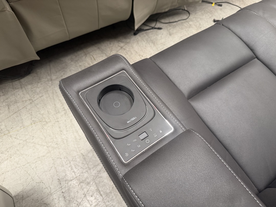 This modern 3-seater lounge is upholstered in slate grey fabric and equipped with electric recliners for effortless comfort. Built-in charging ports and subtle lighting add extra convenience, making it perfect for relaxed evenings.