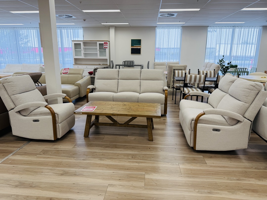 This complete lounge setting includes a spacious 3-seater with recliners and two matching recliner chairs, all upholstered in soft warm grey fabric. Built for comfort and durability, it provides supportive seating and a cohesive look ideal for family living rooms.