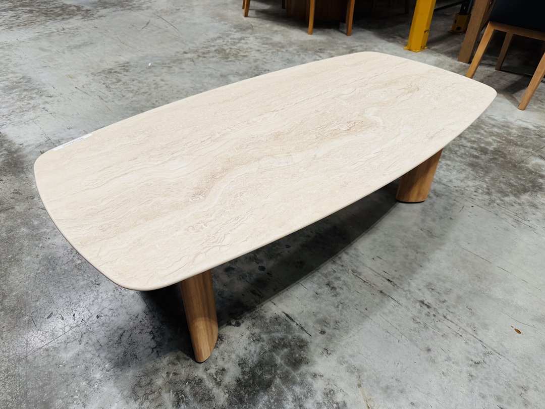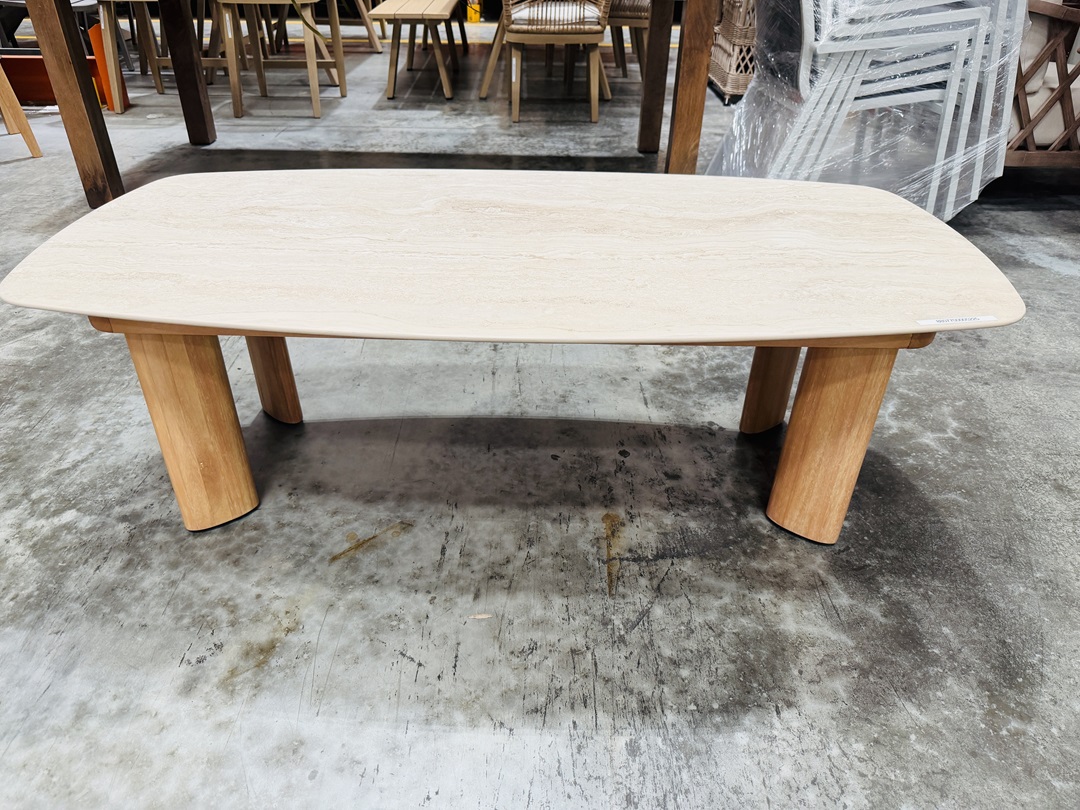 A stylish outdoor coffee table featuring a durable stone top supported by natural timber legs. Combines strength with modern design, ideal for patio or outdoor lounge areas.