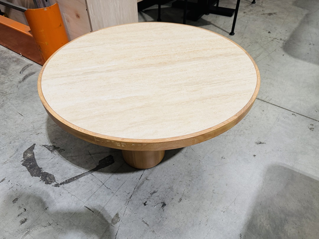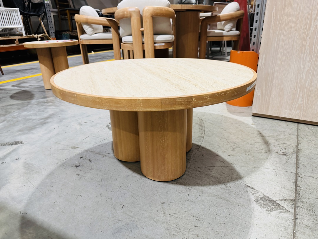 Designed for outdoor living, this round coffee table features a solid stone top supported by a timber base. Its durable construction and clean design make it a stylish centrepiece for patios and outdoor lounge areas.