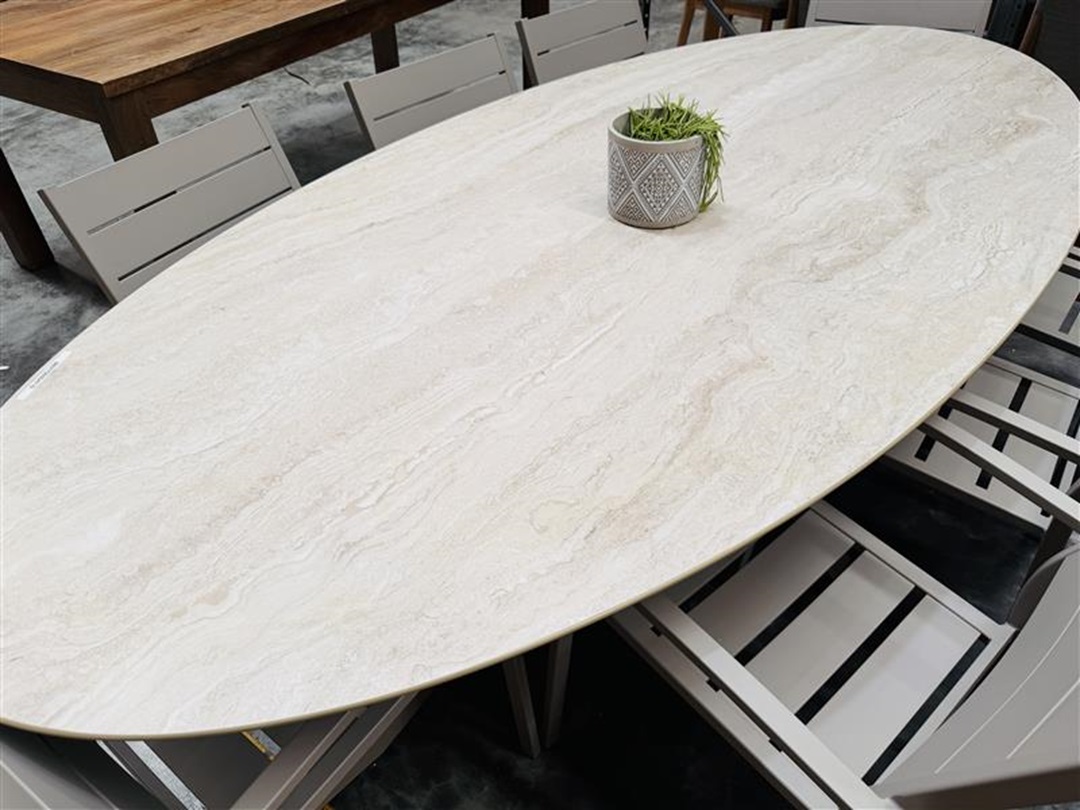 A sleek and modern 260cm outdoor table crafted from durable aluminium with a tempered glass top. Spacious design ideal for large gatherings. Combines strength and sophistication for outdoor living spaces.